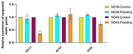 To investigate the relationship between flooding stress and epigenetic modification, we detected the expression changes of key methylation- (MET1) and demethylation-related (ROS1 and DME) genes (Figure 5). The results showed a significant reduction in the expression of MET1 following flooding treatment in ND45, whereas no significant difference was observed in ND38. Moreover, demethylation-related genes showed no difference in the expression of ROS1 between the control and flooding groups in both cultivars. However, DME was significantly downregulated in the flooding group of ND45.
