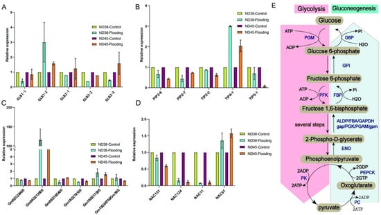 In order to further understand the impact of flooding on plant adaptation to environmental stressors, we investigated the expression changes of several key environmental adaptation factors. We found a significant reduction in the expression of hemoglobin genes GLB1-1, GLB2-2, and GLB 2-3 in the flooding group of ND38, which are known for their oxygen transport function. In the waterlogged group of ND45, the expression levels of GLB1-2 and GLB2-3 were upregulated compared with the control group (Figure 6A). As for aquaporin genes, the expression of PIP2-6, PIP2-7, TIP2-2, and TIP5-1 were decreased in both ND38 and ND45 under flooding stress, but not TIP4-1 (Figure 6B). Meanwhile, expression analysis of genes related to the glycolysis/gluconeogenesis pathway (Figure 6E) showed that Gm02G222400 (fructose-bisphosphate aldolase), Gm08G165400 (phosphoglycerate kinase), and Gm18G219100 (phosphoglycerate mutase (2,3-diphosphoglycerate-independent)) were reduced in the flooding group of ND38, while Gm04G213900 (alcohol dehydrogenase 1), Gm19G017200 (glucose-6-phosphate isomerase) and Gm19G000700 (pyruvate kinase) showed increased expression levels. In contrast, in ND45, the expression of Gm02G222400, Gm18G219100, and Gm19G000700 was decreased, while that of Gm04G213900, Gm08G165400, and Gm19G01720 increased compared with the control group. Among these genes, the expression patterns of Gm02G222400, Gm18G219100, and Gm19G017200 were consistent across the two cultivars, indicating a potential conservation of these genes (Figure 6C). The results regarding NAC TFs indicated that, apart from NAC61, which showed upregulation, the expression levels of NAC151, NAC124, and NAC11 were all downregulated under flooding stress in both cultivars. Notably, NAC124 and NAC11 exhibited the most significant decrease in expression levels compared with the other TFs (Figure 6D). These findings suggest that the expression patterns of identical genes remain largely consistent across the two cultivars, implying a probable functional conservation.