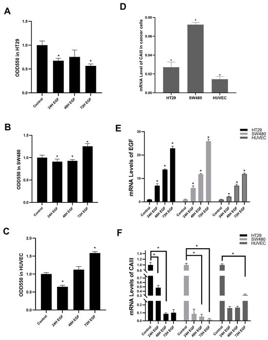 Effect of 20 ng EGF on CAIII. (A) Cell viability of HT29 cells after 20 ng EGF treatment. (B) Cell viability of SW480 cells after 20 ng EGF treatment. (C) Cell viability of HUVEC cells after 20 ng EGF treatment. (D) The mRNA level of CAIII was determined in different cancer cell lines (HT29, SW480 and HUVEC). (E) The mRNA level of EGF was determined in different cancer cell lines after 20 ng EGF treatment (HT29, SW480 and HUVEC). (F) The mRNA level of CAIII was determined in different cancer cell lines after 20 ng EGF treatment (HT29, SW480 and HUVEC). (* p ≤ 0.05).