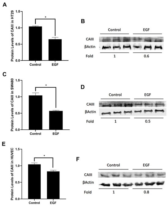 The Western blot technique was used to determine the expression of the increase in CAIII mRNA regulation at the protein level. Western blotting was performed using rabbit anti-CAIII or β-actin antibodies on cell lysates extracted from both EGF-treated and untreated cell pellets. Densitometric analysis was performed using the Image J program. Western blotting demonstrated that EGF lowered the quantity of CAIII protein in HT29, SW480, and HUVEC cells, which is consistent with the qRT-PCR results. It was evident that the HT29 cells’ CAII protein regulation was effectively decreased by EGF (Figure 2A,B). However, the effect was mostly determined in the SW480 cells (Figure 2C,D). The downregulation of CAIII in the HUVEC cells was less remarkable compared to the HT29 and SW480 cells (Figure 2E,F).