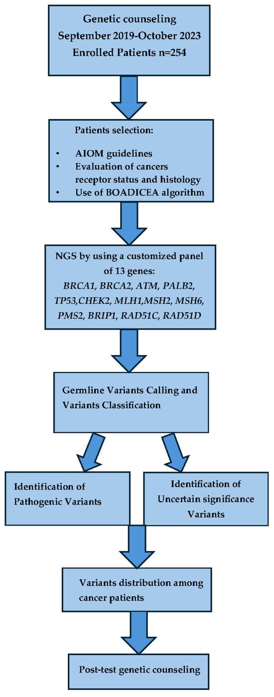 - Paduano, F.; Colao, E.; Fabiani, F.; Rocca, V.; Dinatolo, F.; Dattola, A.; D’Antona, L.; Amato, R.; Trapasso, F.; Baudi, F.; et al. Germline Testing in a Cohort of Patients at High Risk of Hereditary Cancer Predisposition Syndromes: First Two-Year Results from South Italy. Genes 2022, 13, 1286. [Google Scholar] [CrossRef] [PubMed]