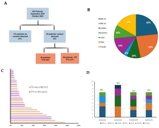 - Bono, M.; Fanale, D.; Incorvaia, L.; Cancelliere, D.; Fiorino, A.; Calò, V.; Dimino, A.; Filorizzo, C.; Corsini, L.R.; Brando, C.; et al. Impact of Deleterious Variants in Other Genes beyond BRCA1/2 Detected in Breast/Ovarian and Pancreatic Cancer Patients by NGS-Based Multi-Gene Panel Testing: Looking over the Hedge. ESMO Open 2021, 6, 100235. [Google Scholar] [CrossRef] [PubMed]