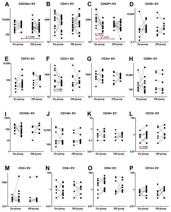 Changes in the levels of different plasma extracellular vesicles after on-pump and off-pump coronary artery bypass surgery. Vesicle type is presented in Table 2. (A) CD235a+ EVs. (B) CD41+ EVs. (C) CD62P+ EVs. (D) CD39+ EVs. (E) CD73+ EVs. (F) CD31+ EVs. (G) CD34+ EVs. (H) CD90+ EVs. (I) CD105+ EVs. (J) CD146+ EVs. (K) CD45+ EVs. (L) CD19+ EVs. (M) CD3+ EVs. (N) CD4+ EVs. (O) CD8+ EVs. (P) CD14+ EVs. Circles demonstrate values before surgery, squares—24 h after surgery.