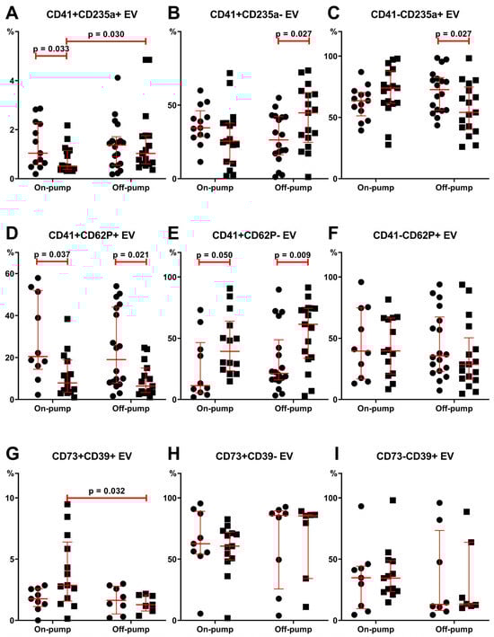 Relative amounts of extracellular vesicles investigated using double-staining protocols of immunophenotyping. Vesicle type is presented in Table 2. (A) CD41+CD235a+ EVs. (B) CD41+CD235a- EVs. (C) CD41-CD235a+ EVs. (D) CD41+CD62P+ EVs. (E) CD41+CD62P- EVs. (F) CD41-CD62P+ EVs. (G) CD73+CD39+ EVs. (H) CD73+CD39- EVs. (I) CD73-CD39+ EVs. Results presented as median and interquartile range before and after on-pump and off-pump CABG. Circles demonstrate values before surgery, squares—24 h after surgery.