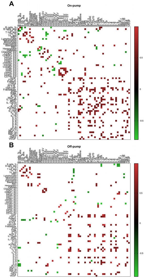 Heatmap of correlations between plasma extracellular vesicles, cytokines, and blood cell parameters in patients after on-pump (A) and off-pump (B) coronary artery bypass grafting.