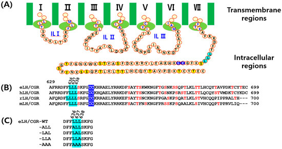 Schematic representation of the structure of equine LH/CGR-wt and mutants. (A) The amino acid sequences of the intracellular loops I–III and C-terminal region of eLH/CGR are shown. (B) A comparison of the amino acid sequences between eLH/CGR and mammalian LH/CGRs in the C-terminal intracellular regions is provided. (C) The trileucine motif mutants of the C-terminus are displayed. Numbers indicate the amino acid positions of the mature protein, excluding the signal sequence. The trileucine region, commonly found in the C-terminus of mammalian LH/CGRs, is highlighted in sky blue. Notably, rLH/CGR contains four leucine residues in this region. Potential phosphorylation sites are marked yellow and red in panels (A,B), while palmitoylation sites at intracellular cysteine residues are indicated in blue in panel B.