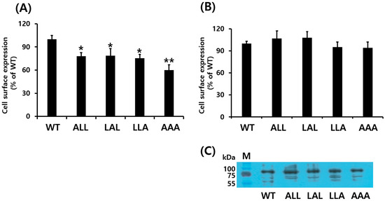 Next, we evaluated the cell surface expression of WT and mutant eLH/CGRs in HEK 293 cells using ELISA. The surface expression of eLH/CGR-wt was set as 100%, with initial measurements at time zero. The expression levels of the eLH/CGR-ALL, LAL, and LLA mutants were approximately 77.9%, 78.7%, and 75.3%, respectively (Figure 2A). The eLH/CGR-AAA mutant exhibited the lowest expression level at 60%. Additionally, receptor protein expression was analyzed via Western blotting (Figure 2B,C), which revealed a major band corresponding to a molecular weight of approximately 80 kDa. Western blot analysis showed higher expression for the eLH/CGR-ALL and LAL mutants compared to WT eLH/CGR, though these results differed slightly from the ELISA data. Nevertheless, the eLH/CGR-AAA mutant consistently showed the lowest expression level across both assays.
