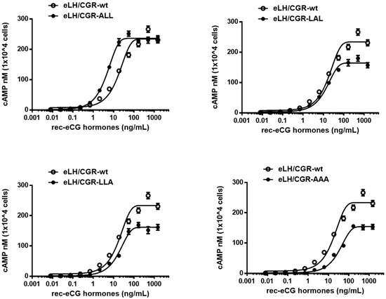 We assessed the in vitro biological activity of WT and mutant eLH/CGRs in transfected CHO-K1 cells by measuring cAMP activation (Figure 3). The dose–response curve for the eLH/CGR-ALL mutant shifted slightly to the left compared to WT, while the curves for the eLH/CGR-LAL, LLA, and AAA mutants shifted to the right.