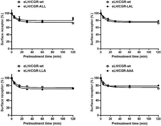 We employed ELISA to evaluate the loss of eLH/CGR from the cell surface following treatment with recombinant eCG (250 µg/mL). HEK 293 cells expressing WT and mutant eLH/CGRs were preincubated with the agonist for 120 min, and the time-dependent reduction in cell surface receptors was analyzed (Figure 4, Table 2). In WT-expressing cells, receptor loss reached approximately 89% within 5 min, decreasing further to 80% at 15 min and 72.7% after 2 h. The surface receptor loss in the eLH/CGR-ALL, LAL, and LLA mutants followed a similar pattern to WT.