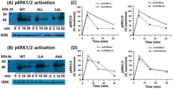In HEK 293 cells transiently expressing WT and mutant eLH/CGRs, recombinant eCG stimulated ERK phosphorylation in a time-dependent manner (Figure 5). In WT cells, rec-eCG induced phospho-ERK1/2 activation within 5 min of agonist treatment, followed by a gradual decline, with 45% of the maximum level remaining after 30 min. Rapid phospho-ERK1/2 activation was also observed in all mutants at 5 min, followed by an abrupt decrease. The phospho-ERK1/2 activity in the eLH/CGR-ALL and LAL mutants dropped to approximately 20% and 40% of the maximum level, respectively, after 15 min of agonist stimulation. No significant differences in phospho-ERK1/2 activity were detected between WT, eLH/CGR-LLA, and eLH/CGR-AAA mutants. These results indicate that the trileucine motif of eLH/CGR plays an independent role in phospho -ERK1/2 activation, receptor surface loss, and PKA signal transduction.