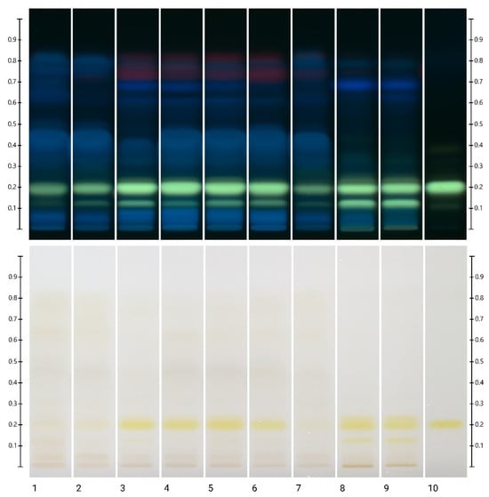 HPTLC analysis of berberine content in twig extracts. Top visible in 366 nm UV light, bottom in visible light. Tracks: 1—‘NN’, 2—‘Superba’, 3—‘Powwow’, 4—‘Golden Carpet’, 5—‘Red Pillar’, 6—‘Golden Ring’, 7—‘Red Tears’, 8—root bark, 9—Berberis vulgaris (organic) root bark, 10—berberine standard.