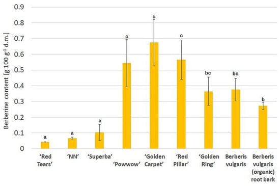 Berberine content in twigs of tested barberry cultivars compared to reference material (B. vulgaris root bark). The bars represent standard deviation; a,b,c—means marked with different letters are significantly different (p < 0.05).