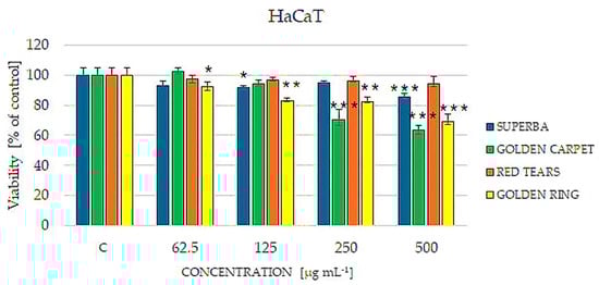 Cultivar-dependent effect of selected barberry extracts (‘Superba’, ‘Golden carpet’, ‘Red Tears’, ‘Golden ring’) on the viability of human keratinocytes HaCaT cells estimated by the Neutral Red assay. The cells were treated with extracts in concentrations of 62.5, 125, 250 and 500 μg mL−1. Non-treated cells were used as a control (C). Data are expressed as median from at least three independent experiments. Error bars represent 25% and 75% percentiles. Statistical significance was assessed using one-way ANOVA and Dunnett’s post hoc test (* p < 0.05, ** p < 0.01, *** p < 0.001).