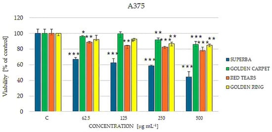 Subsequently, the impact of the analyzed extracts on the viability of A375 melanoma cancer cells was investigated. As shown in Figure 5, the ‘Superba’ extract exhibited the strongest cytotoxic effect among the analyzed extracts. Even the lowest concentration of the ‘Superba’ extract had a statistically significant impact on the cytotoxicity of A375 cells (p < 0.001). At a concentration of 500 µg mL−1, cell viability decreased to 44%. Interestingly, compared to HaCaT cells, A375 cells were sensitive to the ‘Red Tears’ extract, with viability dropping to 80% at concentrations of 250 and 500 µg mL−1 (p < 0.001). The extracts of ‘Golden Carpet’ and ‘Golden Ring’ abundant in berberine had the least impact on A375 cells, showing dose-dependent effects; at the highest concentrations analyzed, the cytotoxic impact on viability was statistically significant. Therefore, our preliminary research suggests that the use of barberry extracts in the treatment of melanoma may be reasonable, however, the observed cytotoxic effect does not seem to be directly related to the berberine content. However, a previous study reported the inhibitory effect of pure berberine on the migration of melanoma cancer cells [].