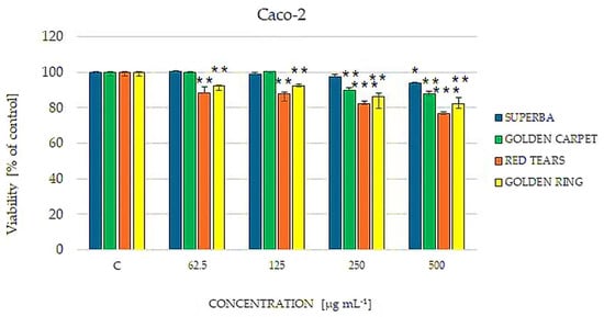 As Caco-2 colorectal cancer cells have been more frequently used in the examination of the mechanism of berberine activity, we also investigated the impact of the analyzed extracts on Caco-2 cells. As shown in Figure 6, the utilized concentration of 500 μg mL−1 had a toxic effect on these cells in the case of all analyzed extracts. A particularly significant impact was noted for berberine-rich ‘Golden Carpet’ and ‘Golden Ring’ extracts but also for ‘Red Tears’ extract. In conclusion, Caco-2 cells were sensitive to barberry twig extracts, but it has not been confirmed that it is dependent on the berberine content.