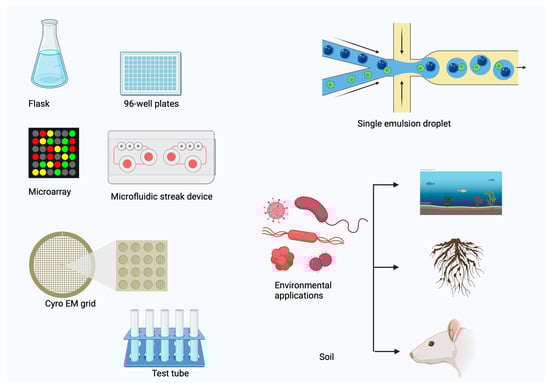 The complicated interactions between microorganisms and high-throughput screening required 50 years of “micro-culturing” progression. Miniaturizing culture conditions allows for the isolation and compartmentalization of microorganisms. Fast-growing species often obscure slower-growing ones due to this type of competition. However, although they are relatively rare, slow-growing organisms account for a sizable fraction of microbial diversity [96]. Slow-growing microbes constitute a large fraction of the microbial diversity, largely restricted to soil, aquatic, and human microbiome niches. An example would be the genus Mycobacterium, for example, Mycobacterium tuberculosis, which is slow growing. They can have generation times in days or weeks but play important roles in either disease or environmental processes. Another example is the genus Bacteroides, predominant in the human gut microbiome. Although some species within this genus grow rather easily, many are classified as slow-growing and play crucial roles in digesting complex carbohydrates and general intestinal health. Many species of the phylum Actinobacteria, especially from the genus Streptomyces, are slow-growing but highly productive regarding antibiotics and other bioactive compounds, highlighting their ecological and pharmaceutical importance. These slow-growing organisms are hard to culture in the lab but represent a considerable fraction of microbial diversity, significantly influencing environmental interactions and human health. Microenvironments are highly understudied, and the microtechnologies discussed here allow researchers to do so on spatiotemporal scales relevant to microorganisms [97].