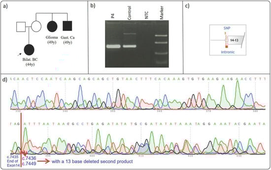 Proband P4 was diagnosed with early-onset bilateral breast cancer (44 y) and had a family history of glioma (49 y) and gastric cancer (49 y) in maternal second-degree relatives (Figure 4a) (Table 2). Genetic testing revealed an intronic missense alteration, c.7436-1G>C (VF:49.3%), in the BRCA2 gene of the proband. To evaluate its clinical significance of the c.7436-1G>C variant, we conducted a comprehensive examination. Sequencing results revealed a 13-base pair deletion at the start of BRCA2 exon 15 (Figure 4b,c), leading to a frameshift that transformed the amino acid sequence at position p.(Asp2478Val) and introduced a premature stop codon.