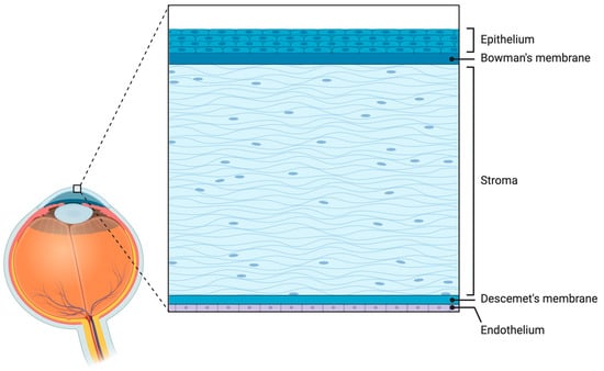 According to the World Health Organization (WHO), corneal blindness is a visual impairment with visual sharpness of 3/60 or less []. The corneal layer consists of endothelial cells, Descemet’s membrane, stroma, Bowman’s layer, and the epithelium. As presented in Figure 1, the corneal epithelial layer is located in the outermost layer while the corneal endothelial layer is located in the innermost layer of the cornea []. Any pathological mechanism that disrupts the transparent layer of the epithelium, stroma, and endothelium layer could lead to corneal blindness []. The anterior part of the cornea commonly becomes damaged by traumatic insults such as lacerations or chemical injury; often leading to visual impairment []. In 2015, corneal blindness caused by corneal opacity and trachoma accounted for 4% of the global causes of visual loss among adults aged 50 years and older [].
