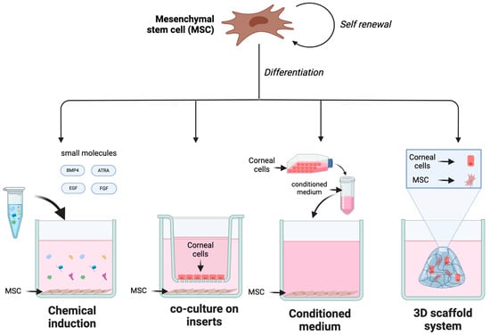 Differentiation of human MSCs in vitro can be achieved through several methods as illustrated in Figure 2. Corneal differentiation can be induced by culturing the MSCs in a conditioned medium, a medium supplemented with signaling molecules only, or by co-culturing with the signal-providing cells via a cell culture insert or a 3D scaffold system [,]. In certain environments, MSCs isolated from mesodermal origin tissue can differentiate not only into mesodermal cell lineages such as osteoblast, chondrocytes, myocytes, and adipocytes but also into ectodermal and endodermal lineages. Trans-differentiation of MSCs is thought to be difficult, but studies have reported that under certain laboratory conditions, adipose-derived MSCs can undergo corneal differentiation and several other ectodermal lineages [,].