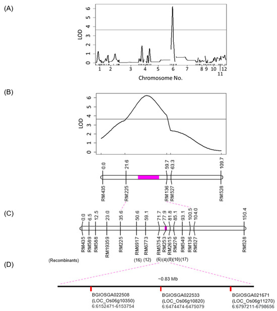 For the genetic mapping of the gene that controls the pigmentation of the four tissues, 92 F2 individuals from the 557 F2 population of AZ1711×IR64 cross (Table 1) were subjected to genotyping using SSR markers. A total of 361 SSR markers selected from the Cornell SSR 2001 genetic map [30] and the IRMI 2003 genetic map [31] (Table S1) were applied to screen the polymorphism between IR64 and AZ1711, and 111 of them were examined as co-dominant markers. In 83 of the 111 polymorphic markers, the genotypes could be determined more precisely and were tested on the 92 F2 individuals. Only six SSR markers did not show the 1:2:1 ratio (p-value < 0.05), and were excluded in the further analysis. Therefore, 77 polymorphic SSR markers were used to construct a linkage map by R/qtl (Figure S2). After the R/qtl analysis, a locus responsible for the pigmentation was mapped between the RM225 and RM136 markers, spanning in a ~5.3 Mb region on Chr. 6, which explains 26.8% (LOD = 6.23) of the phenotypic variation (Figure 2A,B).