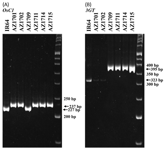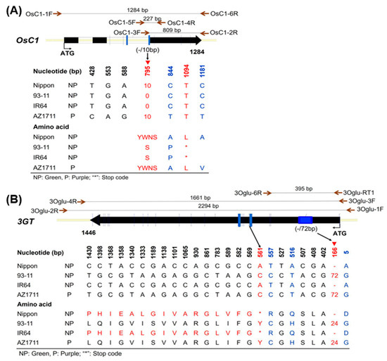 Polymorphism of OsC1 and 3GT gene-specific fragments amplified in the pigmented mutant lines. (A) The gDNA fragments of the OsC1 gene amplified by the OsC1-5F and OsC1-4R primers in Nipponbare, 93-11, IR64, AZ1701, AZ1701.1, AZ1709, AZ1711, AZ1714, and AZ1715, respectively. (B) The gDNA fragments of the 3GT gene by the 3Oglu-RT1 and 3Oglu-6R primers in Nipponbare, 93-11, IR64, AZ1701, AZ1701.1, AZ1709, AZ1711, AZ1714, and AZ1715, respectively.