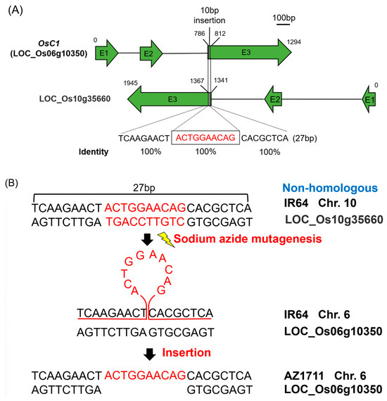 The next challenge is to identify the origins of the two insertional fragments and the mechanisms underlying the two mutations. The insertion of a DNA fragment into a chromosome requires that the insertion site in the chromosome has two flanking sequences that are highly homologous to the two end sequences of the fragment. As mentioned above, the OsC1 gene in the color mutant AZ1711 was inserted by a 10 bp fragment. To understand how AZ1711 gained the 10 bp insertion, the sequences that include the 10 bp sequence and its 500 bp up and downstream sequences were used to BLAST the NCBI and Ensembl Plants databases. The results showed that Chr. 3, 4, 9, and 10 are aligned with 100% identity to the 10 bp insertion in AZ1711, but the 27 bp fragment in Chr. 10 is the only longer fragment with 100% identity. The 27 bp segment in AZ1711, including the 10 bp insertion fragment, is entirely identical to the reversed segment located in Chr. 10 (LOC_Os10g35660) in Oryza sativa ssp. japonica (Nipponbare) and O. sativa ssp. indica (93-11) (Figure 5). The orthologous fragment on Chr. 10 also encodes an MYB TF-like gene; however, its function has not yet been defined in rice.