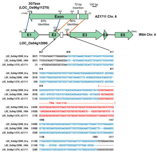 Comparison of the homologous sequences of 3GT in the AZ1711 genome. The 3GT (LOC_Os06g11270) and the LOC_Os04g12090 genes have homologous sequences. Two sequence homologs of the Ty1-Copia retrotransposon (RT) (LOC_Os04g12090) with 90% and 83% identities with Nipponbare and AZ1711, respectively. The blue-colored sequence represents the region that showed 90% and 83% identities. The red-colored sequence represents the 72 bp insertion. The white boxes represent the 72 bp insertion of AZ1711 and the green boxes represent exons (E1–E5). The non-pigment of Nipponbare is due to the deletion of the 72 bp fragment.