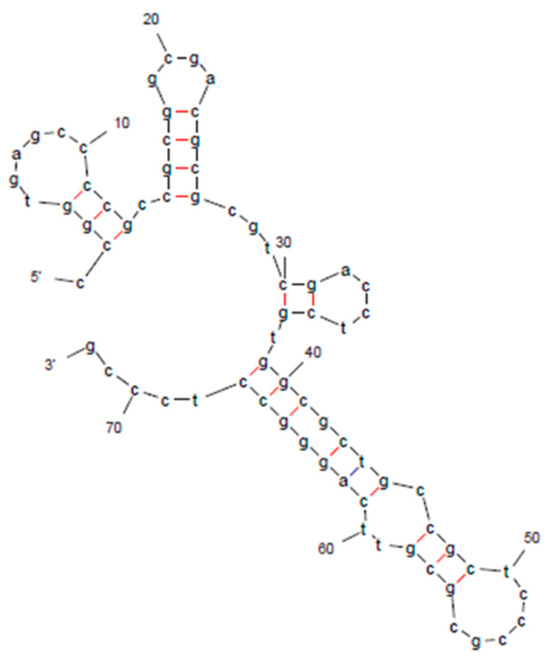 The predicted secondary structure of the 72 bp insertional fragment in the 3GT of the AZ1711 line contains four hairpin loops (at ~10th, 20th, 35th, and 50th nucleotide positions), a multi-loop (5′–3′), and an internal loop (at ~60th nucleotide position).