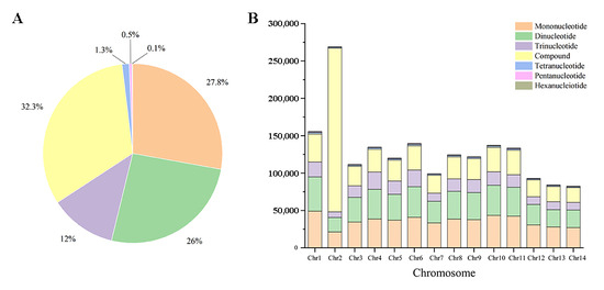 The InDel-SSR nucleotide repeat types had about 956 forms with one to six nucleotides (Figure 2A). The most frequent were the mononucleotide repeat types (A/T, C/G), about 502,598 (27.83% of the total). The dinucleotide repeat types included AT/TA, AG/CT, GA/TC, and AC/GT, with 468,736 loci (25.96%). Trinucleotide repeat types showed 216,506 loci (11.99%). Tetranucleotide repeat types showed 23,112 loci (1.28%). Pentanucleotide repeat types showed 8626 loci (0.48%). Hexanucleotide repeat types showed 2563 loci (0.14%). In addition, 583,493 compound nucleotides made up 32.32% of the total. Similar nucleotide repeat type distributions in the InDel-SSRs could be observed across all chromosomes (Figure 2B).