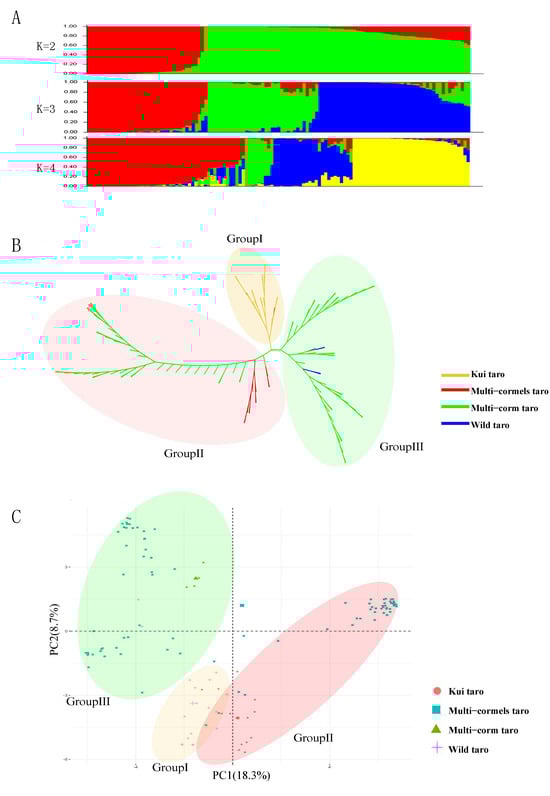 Genetic diversity analysis of taro germplasm resources. (A) Population structure analysis. (B) UPGMA-based cluster analysis of taro germplasm resources. (C) Principal component analysis.