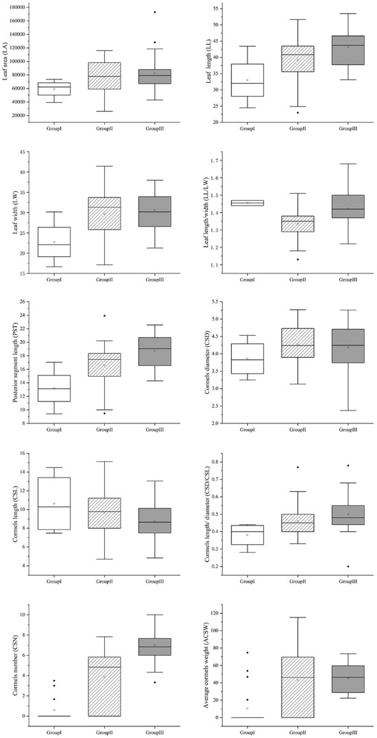 Population genetic structure and cluster analysis of taro germplasm resources revealed that all germplasm could be optimally divided into three groups (Figure 4A,B). Group I contained 18 wild taros and 1 kui taro. Group II contained 41 multi-cormel taros and 12 kui taros. Group III contained 45 multi-cormel taros and 4 multi-corm taros. The results indicated that kui taro is genetically closer to wild taro and more distantly related to multi-cormel taro and multi-corm taro. In particular, multi-cormel taro has the greatest genetic variation and is thus divided into two separate groups, indicating that they may have different origins. PCA also supported these findings, demonstrating that kui taro is more closely related to wild taro. While multi-cormel taro is more closely related to multi-corm taro, multi-cormel taro showed significant genetic diversity (Figure 4C, Supplementary Table S3). Moreover, statistical analysis of agronomic traits among the groups revealed significant differences in leaf length, leaf shape index, posterior segment length, cormel shape index, and cormel number, indicating that plants in group I are significantly smaller than those in groups II and III in terms of leaf area, leaf width, cormel diameter, and average cormel weight (Figure 5).