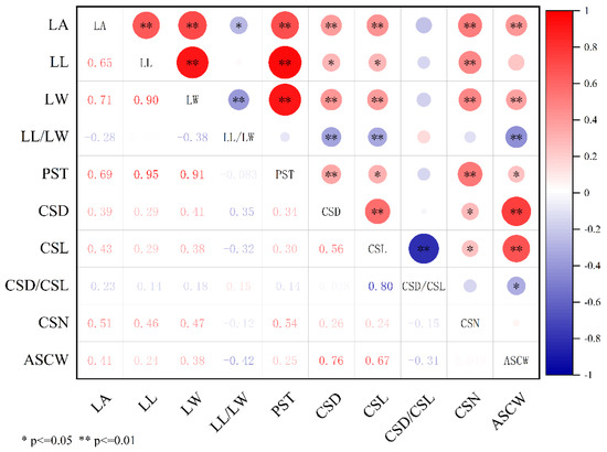 Correlation analysis of important agronomic traits of taro. * p ≤ 0.05, significant correlation; ** p ≤ 0.01, highly significant correlation.