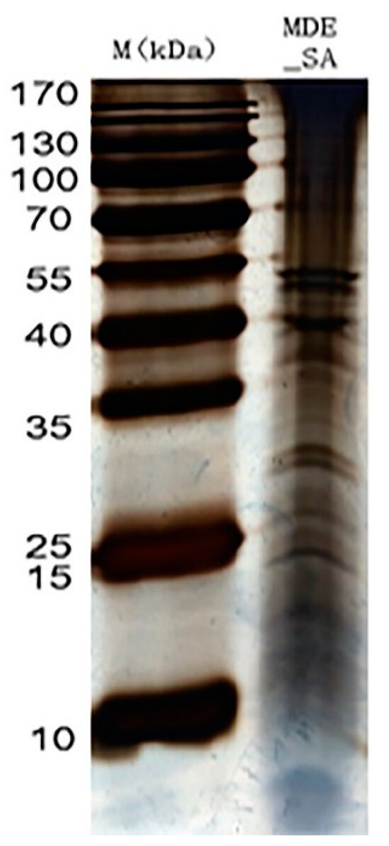 The schematic illustration of salivary protein bands of M. dirhodum (MDE_SA) in reference to marker (M).