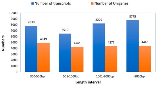 Altogether, 47,565,328 bp of raw reads were retrieved from the sequencing of the established library. After removing low-quality reads, ambiguous reads, and those related to adapters, 46,238,772 clean reads were produced using Illumina paired-end RNA-seq technology, achieving a Q20 value of 97.61% in the transcriptomic assembly. Approximately 39,293,370 reads (84.98% of the total clean reads) were successfully aligned to the reference sequence (the longest transcript unigene). After filtering out adapter-related reads (609272), ambiguous reads (18194), and low-quality reads (35812), clean reads were retained. The transcriptome of the rose-grain aphid head was then de novo assembled using the short-read assembling program (Trinity), resulted in the clustering of 31,344 transcripts and 18,030 genes (Table 1). The transcripts varied in length from 301 to over 2000 base pairs, with an average size of 1532 base pairs. Out of the transcripts, 7830 (24.98%) were in the range of 301 to 500 base pairs, 6510 (20.77%) were between 501 to 1000 base pairs, 8229 (26.25%) ranged from 1001 to 2000 base pairs, and 8775 (28%) were longer than 2000 base pairs. Furthermore, among the genes that were assembled, 4949 (27.45%) had ranged between 301 to 500 base pairs, and 4261 (23.63%) fell within the range of 501 to 1000 base pairs. Among the genes analyzed, 4377 (24.27%) fell within the range of 1001 to 2000 base pairs, while 4443 (24.64%) surpassed the 2000 base pair mark (Figure 3). The mean size of the genes derived from the transcripts was 1413 base pairs. In comparison, the transcripts produced by Trinity had an average length of 1532 base pairs (N50 = 2335 bp), demonstrating longer transcripts than the average gene length of 1413 base pairs (N50 = 2205 bp). All unigenes assembled in this study are illustrated in Supplementary Table S1. The raw sequencing data have been submitted to the Sequence Read Archive (SRA) of the National Center for Biotechnology Information (NCBI) database with the accession number PRJNA1134911 (http://www.ncbi.nlm.nih.gov/bioproject/PRJNA1134911, accessed on 5 February 2024).
