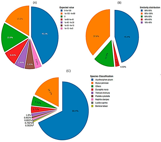The newly de novo assembled transcriptomic sequences, were examined using a BLAST search against the NCBI database to deduce the functional and structural characteristics of the proteins encoded by these transcripts. The comparison involved matching all coding sequences from M. dirhodum genes with established transcriptomic sequences from various aphid species found in publicly accessible protein databases, such as Nr, Swiss-Prot, and Pfam. Consequently, the de novo assembly of M. dirodum transcripts resulted in the prediction of 12,589, 9467 and 9314 functionally characterized and hypothetical gene products (proteins) in the Nr, Swiss-Prot and Pfam genome databases, respectively. The e-value distribution of the top matches against the nr database revealed that, 17.18% of the sequences exhibited strong homology (e-value < 1.0 × 10−60), with most e-values falling between 0 and 1.0 × 10−100 (Figure 4A). Furthermore, the similarity distribution indicated that 97.18% of the unique sequences with top matches had a similarity greater than 60%, while 2.82% of the hits showed a similarity below 60% (Figure 4B). Additionally, the sequences of assembled unigenes were compared to genome sequences from other organisms available in major databases to check for conserved genes through a homologous sequence search. The majority of unigene sequences (68.2%) were matched with A. pisum sequences, followed by M. persicae (18%) (Figure 4C). However, a portion of the gene transcripts (13.7%) showed less similarity to other aphid species.