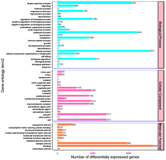 Head tissue libraries were annotated utilizing BLASTx against the NCBI database, and all unigenes underwent homology searches. The functional annotation of all unigenes from M. dirhodum were subjected to a BLAST search against seven databases including NCBI’s non-redundant protein (Nr) and nucleotide (Nt) sequences, protein family (Pfam), the manually annotated and reviewed Swiss-Prot protein sequence database, Eukaryotic Clusters of Orthologous Groups of proteins (KOG/COG), the Kyoto Encyclopedia of Genes and Genomes (KEGG) Ortholog database and Gene Ontology (GO). This comprehensive approach was employed to annotate the functions of each gene transcript. Of the total assembled unigenes (18,030), 12,589 (69.82%), 14,253 (79.05%), 5587 (30.98%), 9467 (52.5%), 9314 (51.65%), 9314 (51.65%) and 5850 (32.44%) genes were matched to known proteins in the non-redundant protein sequences, non-redundant nucleotide sequences (Nt), KEGG Orthology (KO), Swiss-Prot, Protein family (Pfam), Gene Ontology (GO), and Eukaryotic Orthologous Groups (KOG) databases, respectively (Table 2). The alignment result of the total unigenes were not similar across all databases and hence, the NR database results were preferentially employed to annotate all unigenes.