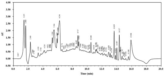 To demonstrate the complexity of the A. japonicus extract and justify the use of the crude extract over isolated compounds, a full-scan HPLC analysis was performed. The HPLC chromatogram of the crude extract of A. japonicus revealed a total of 60 peaks representing various bioactive compounds with different retention times. This complexity suggests potential synergistic effects among the compounds, which may enhance its bioactivity compared to that of its individual isolated components. The major peak, with an area value of 57,897,963, was observed at 15.908 min, while the lowest peak appeared at 0.617 min (Figure 1).