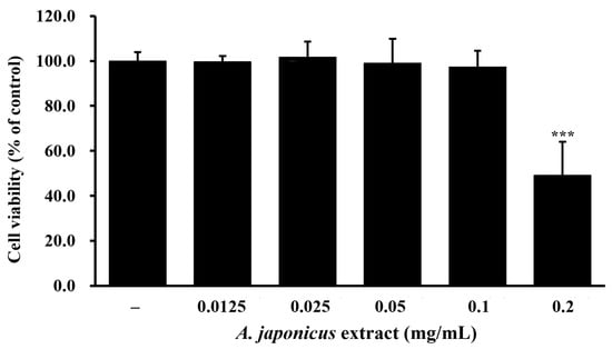 First, we performed an MTS assay to determine the appropriate non-cytotoxic concentration range by confirming the cell viability of A. japonicus extract. RAW 264.7 cells were treated with various concentrations of A. japonicus extract (0.0125–0.2 mg/mL) for 24 h. No cytotoxic effects were observed at concentrations ranging from 0.0125 to 0.1 mg/mL (Figure 2). Therefore, A. japonicus extract did not affect RAW 264.7 cell viability at these concentrations and was analyzed for its anti-inflammatory effects within this non-cytotoxic range.