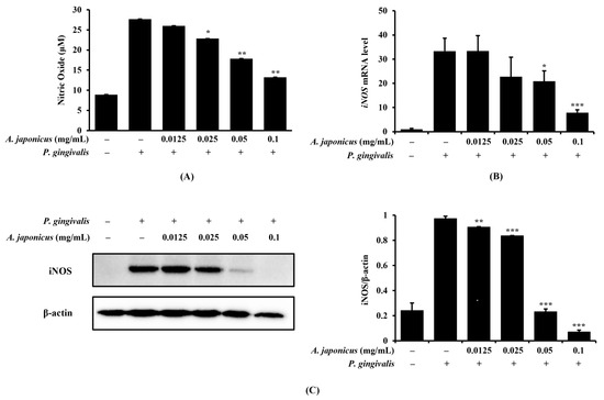 Inhibitory effect of A. japonicus extract on nitric oxide (NO) production and inducible nitric oxide synthase (iNOS) expression in Porphyromonas gingivalis-stimulated RAW 264.7 cells. RAW 264.7 cells were pretreated with various concentrations of A. japonicus extract (0.0125–0.1 mg/mL) for 2 h and then stimulated with P. gingivalis (1 × 107 CFU/mL) for 24 h. (A) NO concentrations were measured using a Griess assay. The (B) mRNA and (C) protein levels of iNOS were determined by quantitative real-time PCR (qRT-PCR) and a Western blot, respectively. iNOS levels indicate changes in protein expression normalized to β-actin levels. Data are presented as the mean ± SD, in triplicate. * p < 0.05, ** p < 0.01, *** p < 0.001, compared to the P. gingivalis-stimulated cells.