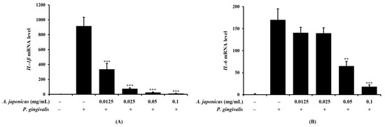 Effects of A. japonicus extract on interleukin (IL)-1β and IL-6 production in P. gingivalis-stimulated RAW 264.7 cells. RAW 264.7 cells were pretreated with various concentrations of A. japonicus extract (0.0125–0.1 mg/mL) for 2 h and then stimulated with P. gingivalis (1 × 107 CFU/mL) for 24 h. The mRNA levels of (A) IL-1β and (B) IL-6 were measured by qRT-PCR. IL-1β and IL-6 mRNA levels were normalized to β-actin mRNA levels. Data are presented as the mean ± SD, in triplicate. ** p < 0.01 and *** p < 0.001, compared with P. gingivalis-stimulated cells.