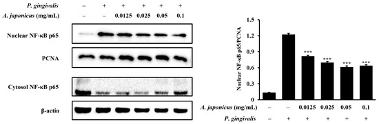 Effect of A. japonicus extract on nuclear factor kappa B (NF-κB) expression in P. gingivalis-stimulated RAW 264.7 cells. RAW 264.7 cells were pretreated with various concentrations of A. japonicus extract (0.0125–0.1 mg/mL) for 2 h and then stimulated with P. gingivalis (1 × 107 CFU/mL) for 20 min. Subsequently, nuclear and cytoplasmic fractions were separated and subjected to Western blot analyses. NF-κB p65 levels were assessed in the nuclear and cytoplasmic fractions. Proliferating cell nuclear antigen (PCNA) and β-actin were used as loading controls for the nuclear and cytoplasmic extracts, respectively. The relative quantification of NF-κB p65 levels in the nuclear fraction was normalized to PCNA levels. Data are presented as the mean ± SD of triplicate experiments. *** p < 0.001, compared with P. gingivalis-stimulated cells.