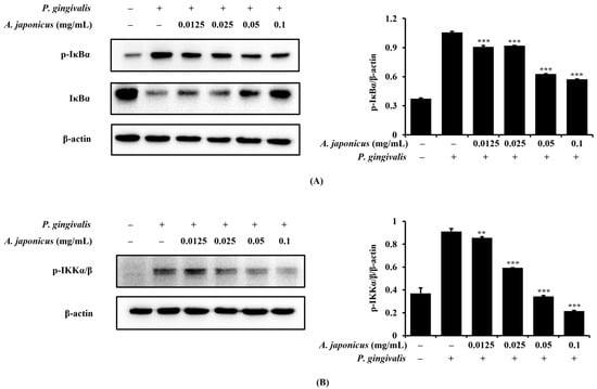 Effects of A. japonicus extract on NF-κB inhibitor α (IκBα) and IκB kinase (IKK)α/β phosphorylation in P. gingivalis-stimulated RAW 264.7 cells. RAW 264.7 cells were pretreated with various concentrations of A. japonicus extract (0.0125–0.1 mg/mL) for 2 h, followed by stimulation with P. gingivalis (1 × 107 CFU/mL) for 10–15 min. Subsequently, cells were harvested and cell lysates were prepared for a Western blot analysis of the indicated proteins. (A) phosphorylated (p)-IκBα and IκBα levels in the cytoplasmic extracts. Relative quantification of IκBα phosphorylation normalized to β-actin levels. (B) p-IKKα/β levels in the cytoplasmic extracts. Relative quantification of IKKα/β phosphorylation normalized to β-actin levels. Data are expressed as the mean ± SD of triplicate experiments. ** p < 0.01 and *** p < 0.001, compared with P. gingivalis-stimulated cells.