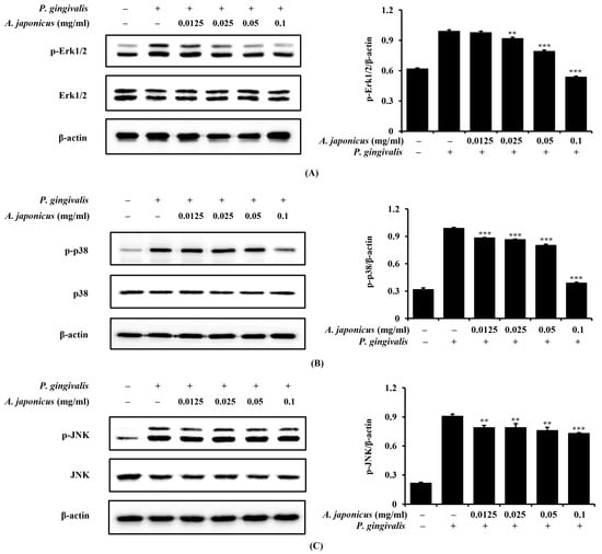 Effects of A. japonicus on the mitogen-activated protein kinase (MAPK) signaling pathway in P. gingivalis-stimulated RAW 264.7 cells. RAW 264.7 cells were pretreated with various concentrations of A. japonicus extract (0.0125–0.1 mg/mL) for 2 h and then stimulated with P. gingivalis (1 × 107 CFU/mL) for 15 min. Cell lysates were analyzed using a Western blot analysis to assess the effect on the expression levels of (A) extracellular signal-regulated kinase (ERK), phosphorylated (p)-ERK, (B) p38, p-p38, and (C) c-Jun N-terminal kinase (JNK), p-JNK. All signals were normalized to β-actin levels, which served as an internal control. Data are expressed as the mean ± SD of triplicate experiments. ** p < 0.01 and *** p < 0.001, compared with the P. gingivalis-stimulated cells.