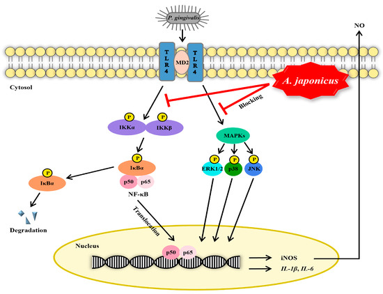 iNOS expression is known to be regulated by NF-κB, an inflammatory transcription factor [40]. Under normal conditions, NF-κB is present in the cytoplasm and binds to IκBα; however, upon stimulation, the p65 subunit of NF-κB is phosphorylated and translocates to the nucleus, inducing the transcription of inflammatory genes [31,41]. The inhibition of NF-κB activity inhibits the phosphorylation of IκBα, thereby blocking the migration of NF-κB to the nucleus and inhibiting the inflammatory response. Considering that A. japonicus extract inhibited iNOS expression, we investigated its effect on the NF-κB pathway in P. gingivalis-stimulated RAW 264.7 cells. The A. japonicus extract inhibited the increase in NF-κB expression in the nucleus induced by P. gingivalis stimulation. It also inhibited the increase in p-IκBα levels and the decrease in IκBα levels in the cytoplasm, indicating its effective blocking of IκBα phosphorylation. In addition, the phosphorylation of IKKα/β induced by P. gingivalis was also inhibited following treatment with the A. japonicus extract. These results confirmed that the A. japonicus extract exhibited an anti-inflammatory effect through its inhibition of the NF-κB pathway.