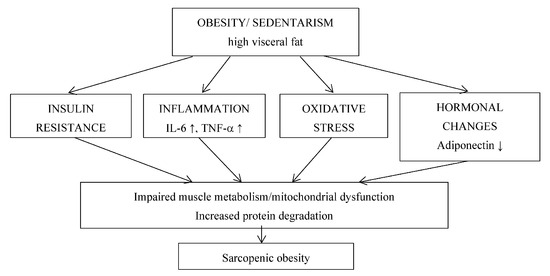 Nowadays, the researchers emphasize that oxidative stress may represent an important pathophysiological link between sarcopenia and obesity. It was demonstrated that oxidative stress increases the catabolic activity and decreases the anabolic pathway in muscle mass [22,23].