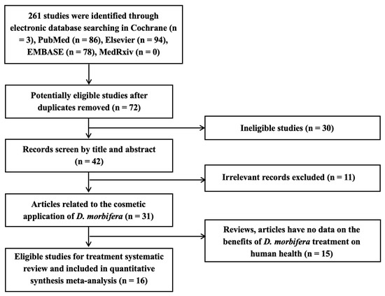 The screening process for the summarized articles is shown in the flowchart (Figure 1). In this study, 261 publications were collected by searching electronic databases using the aforementioned keywords. After the careful screening of these articles by the three reviewers, individual studies were selected to assess the cosmetic properties of DME using a meta-analysis.
