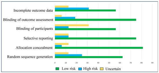 Eligible studies were qualified by considering the bias in the random sequence generation, selective reporting, allocation concealment, blinding of participants, blinding of outcome assessment, and incomplete outcome data, following the Cochrane guidelines [23]. There were three levels of assessment–low risk, high risk, and uncertain–to exhibit the lack of information and uncertainty over the potential for bias. Nearly all the criteria exhibited a low risk of bias, resulting in an evident enhancement of the statistical significance of the meta-analysis (Table 2 and Figure 2).