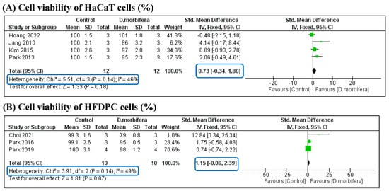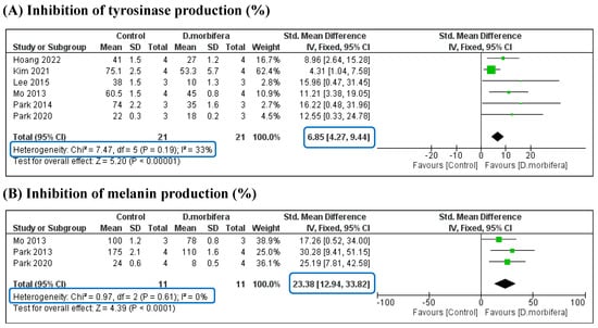 The first subgroup analysis evaluated the efficacy of DME-based methanol extraction in reducing the production of tyrosinase and melanin. Two eligible studies were included in this manner [3,27], which showed significant differences in tyrosinase and melanin production between the two groups. The DME treatment resulted in a decrease in tyrosine and melanin content compared to the control group. This subgroup achieved good statistical significance, with I2 = 32% and p = 0.22 (Figure 7A).