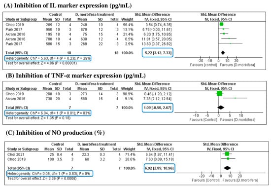 This analysis aimed to evaluate the impact of DME on inflammation signals based on a comparison with three sub-criteria: inhibition of the expression of IL markers (pg/mL), inhibition of the expression of TNF-α (pg/mL), and inhibition of NO production (%). The SMD of each analysis is presented in Figure 5 and Table 3. The meta-analysis indicated that the DME treatment significantly inhibited the expression of pro-inflammatory IL markers, with an SMD of 5.22 [3.12, 7.33] (I2 = 29% and p = 0.23). The production of NO was also reduced in the treatment group compared to the control groups, with significant differences in SMD (6.92 [2.89, 10.96], I2 = 0%, and p = 0.83). However, the expression of TNF- was not significantly different between the two groups, indicating that the DME treatment was ineffective in suppressing the pro-inflammatory TNF-α marker (SMD = 1.09 [−0.5, 2.67]).