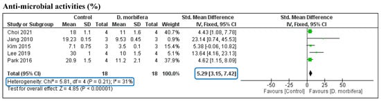 The pooled SMD of the five studies on the antimicrobial activity of DME was assessed by analyzing the statistical differences in bacterial growth between the treatment and the control groups. The pooled SMD was significantly different between the two groups (SMD = 5.29 [3.15, 7.42]) without any heterogeneity (I2 = 31%, p = 0.21) (Figure 6 and Table 3). This indicates that DMEs can effectively suppress bacterial growth and therefore be used in the treatment of skin disorders caused by microbes.